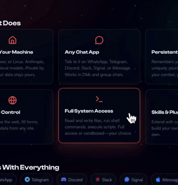 它运行在你本地的Mac 或服务器上,通过最熟悉的聊天软件(如 Slack、Teams、iMessage 或 Telegram)作为交互入口,可以直接操控本地文件、终端、甚至浏览器。