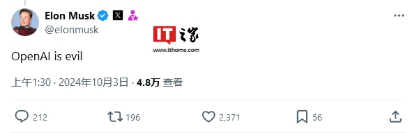 OpenAI 的联合创始人埃隆・马斯克(Elon Musk)在 X 平台上,转发了金融时报的报道,并评论道“OpenAI 就是个恶魔”。