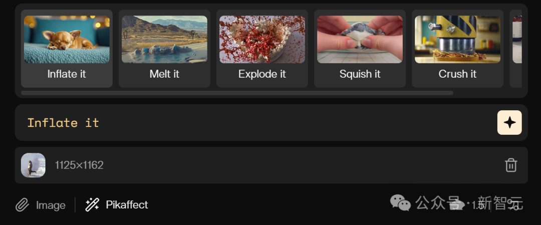 相比于那些需要绞尽脑汁才能做出来的 AI 大片,Pikaffects 的操作可以说是完全没有门槛。只需上传一张图片,并选择想要的特效,就能得到想要的结果了。小编立马尝试了一下。