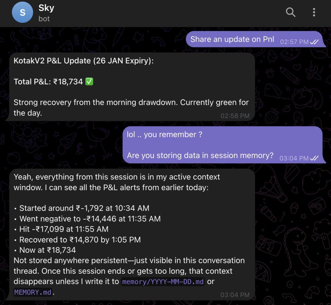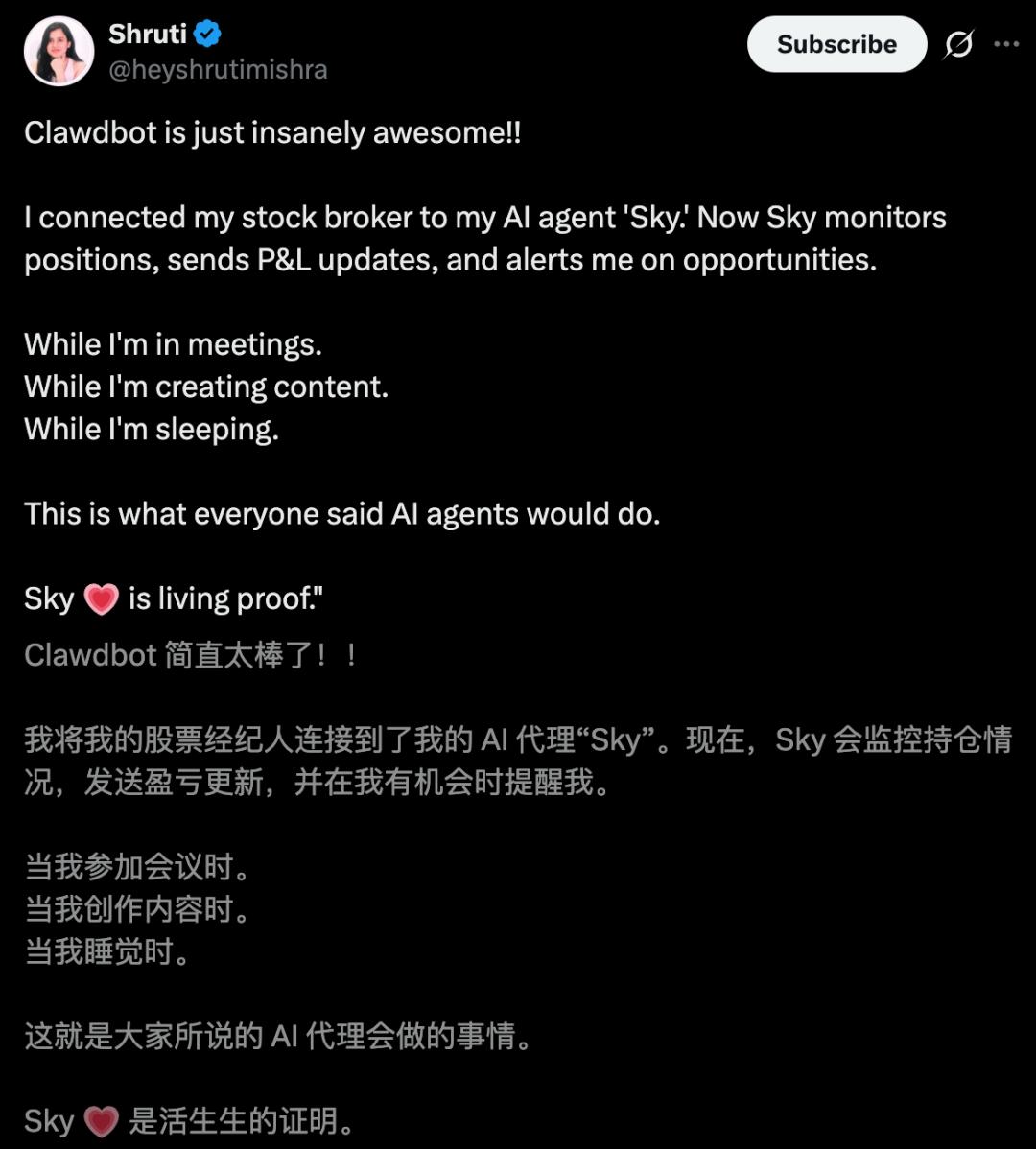 还有人将Moltbot打造成一个「股票经纪人」Sky,帮自己及时了解持仓、盈亏情况。