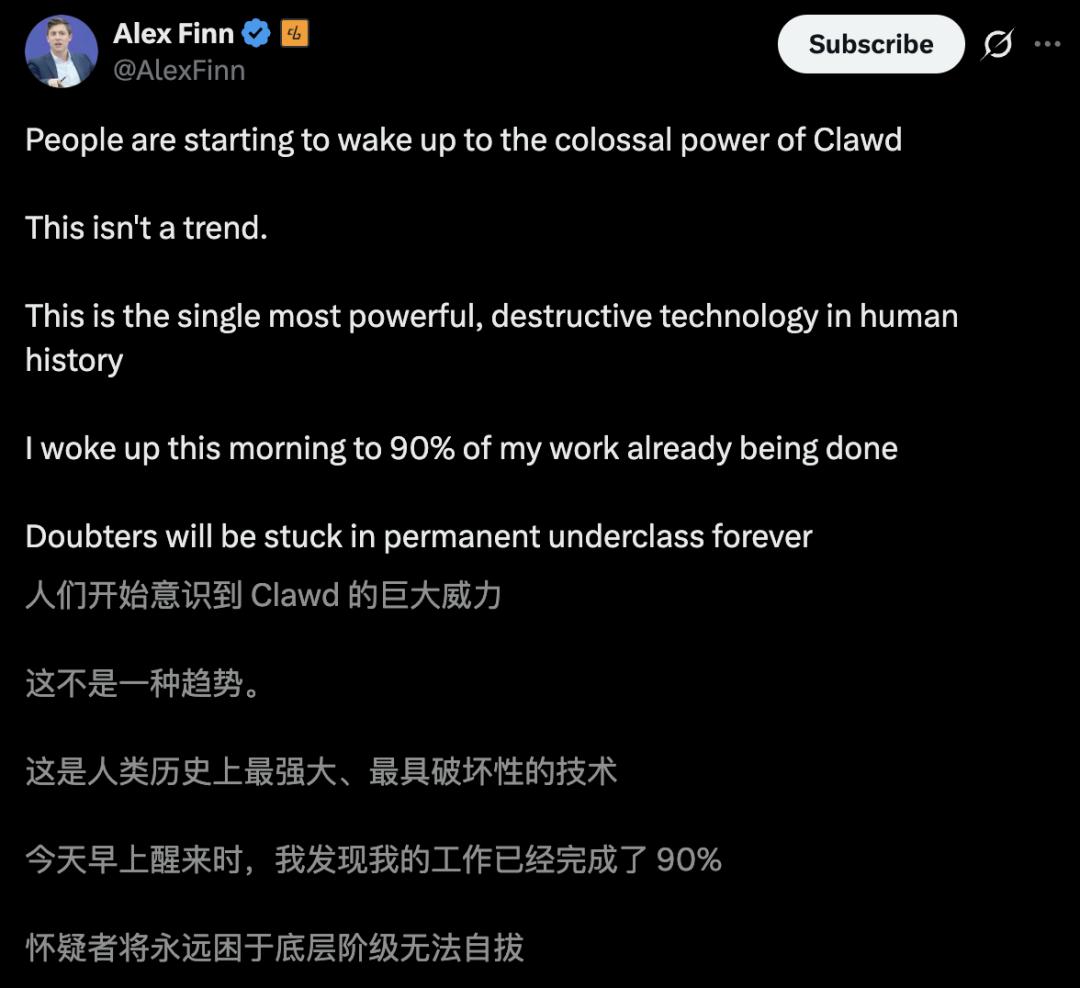 初创CEO Alex Finn感慨道,这绝非某种转瞬即逝的流行趋势,而是人类历史上最强大、最具颠覆性的单一技术。