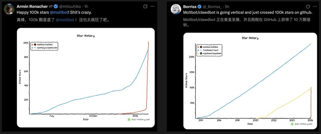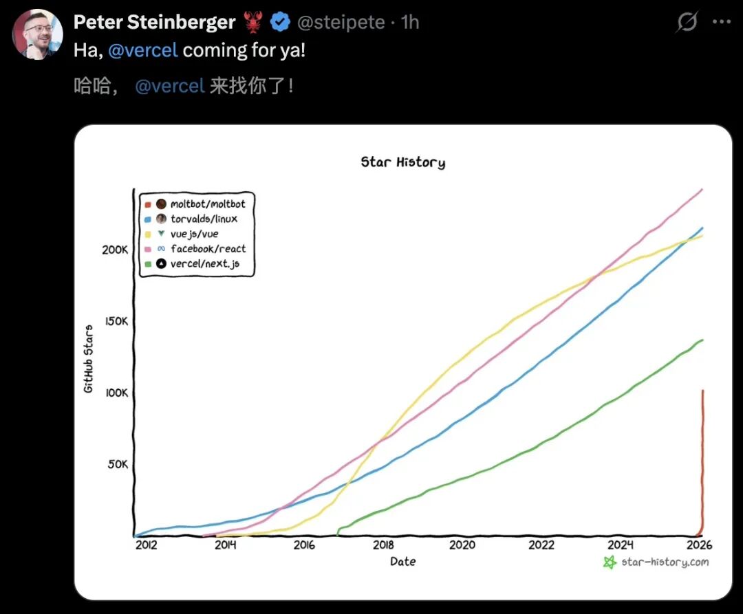Moltbot之父Peter Steinberger立即晒出成绩单,一张项目星标趋势对比图引爆全网。