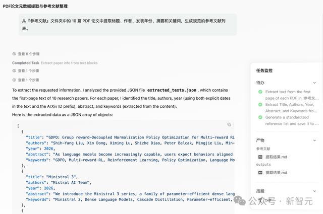 在右边任务监控中,它设定了一系列待办事项,还有要用到的Skills,以及输出的内容。