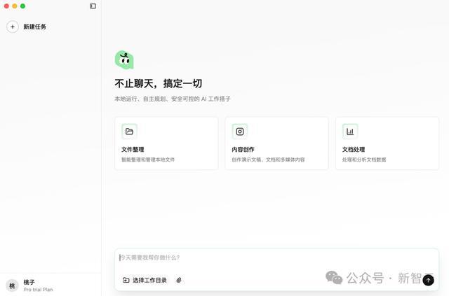 界面左侧是新建/历史任务,右侧是预设好的三种场景「文件整理、内容创作、文档处理」,以及一个可以上传附件的对话框。