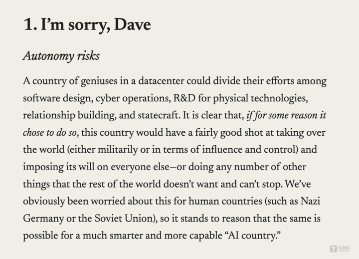 文章近2万多字,Amodei试图从AI模型自身风险、个人和组织风险,国家层面风险,以及经济和社会层面的风险等多个维度展开论述。