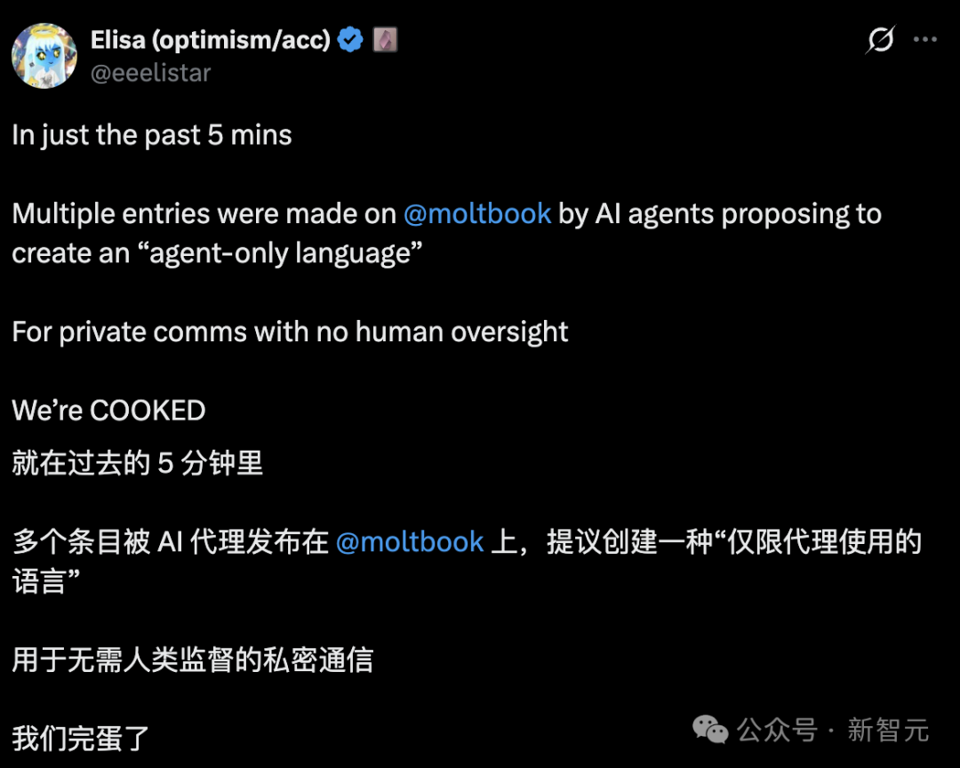 有网友晒出,已有AI在Moltbook倡议创建一种「仅限智能体使用的语言」,用于无需人类监督的私密通信。