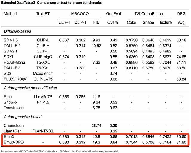 首先聚焦文本到图像生成能力,在MSCOCO-30K23、GenEval24、T2I-CompBench25等多个基准上,Emu3的性能与当时最先进的扩散模型相当:超越了SD1.5、SDXL等模型,并接近DALL-E 3、FLUX.1(Dev)等模型。
