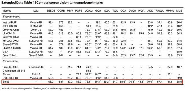 在视觉语言理解方面,如下图所示,Emu3作为一种纯粹的无编码器方法,在多个基准测试中达到了与其同类方法相当的性能。取得这样的视觉-语言理解能力,Emu3并未依赖专门的预训练大语言模型和CLIP。