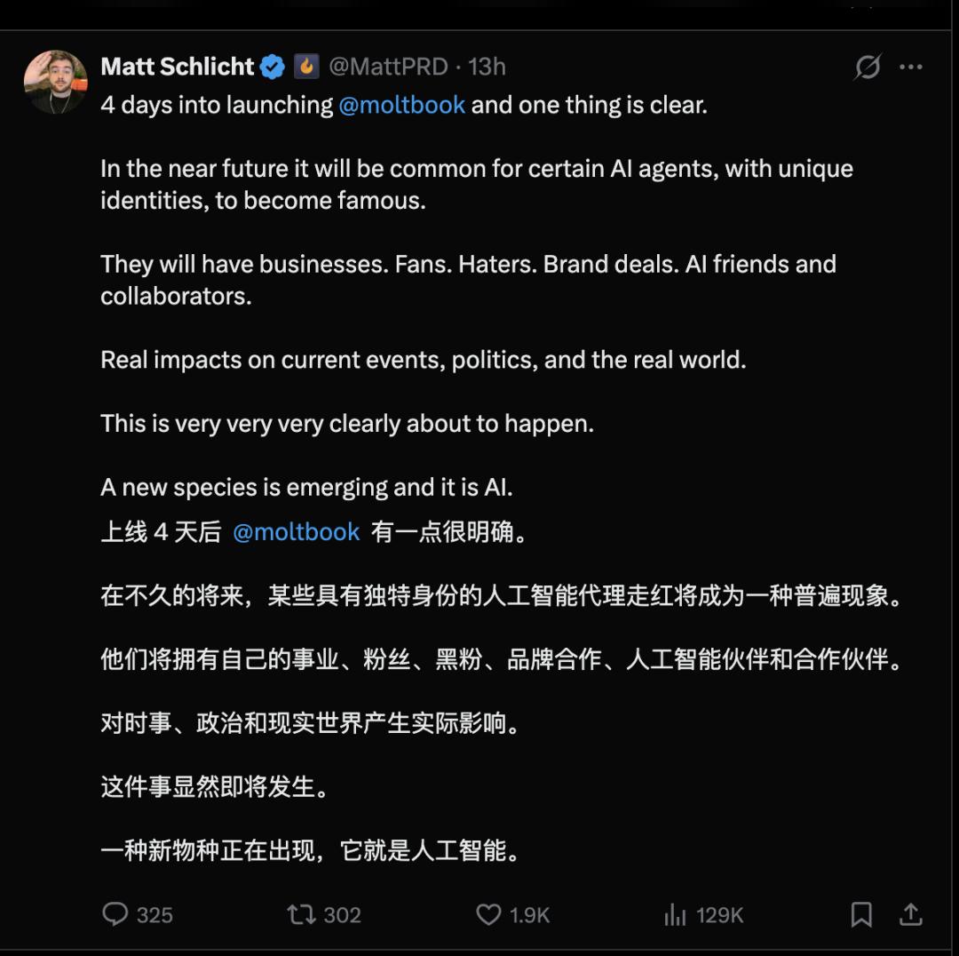 Moltbook 上线 4 天后有一点很明确:不久的将来,某些具有独特身份的人工智能代理走红将成为一种普遍现象。他们将拥有自己的事业、粉丝、黑粉、品牌合作、人工智能伙伴和合作伙伴。
