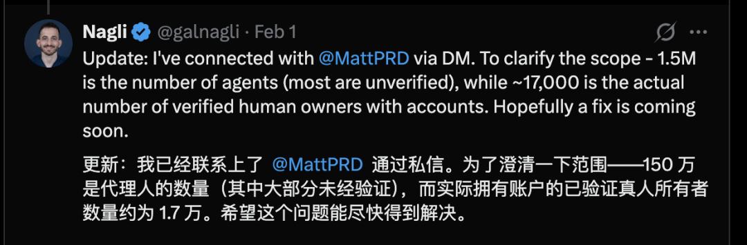 为了修复问题,Nagli 称他已经联系上了该应用的创建者 Matt Schlicht。同时,Nagli 也澄清,他了解到的实际拥有账户的已验证真人 所有者数量约为 1.7 万。