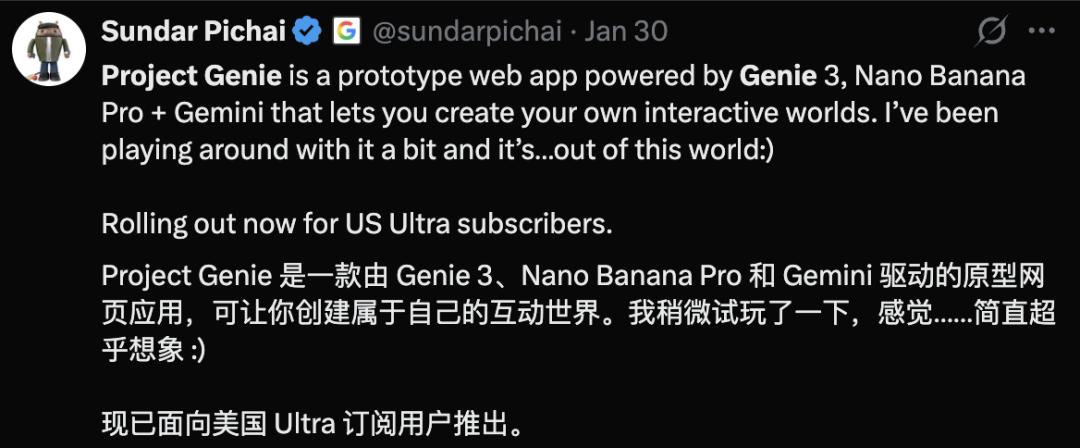 「劈柴哥」(谷歌CEO(Sundar Pichai)试玩后自家产品后,极力推荐:「感觉超乎想象」,并表示现已向美国Ultra订阅用户推出。