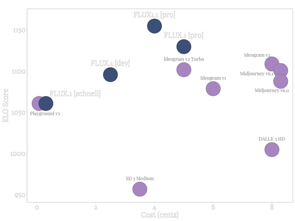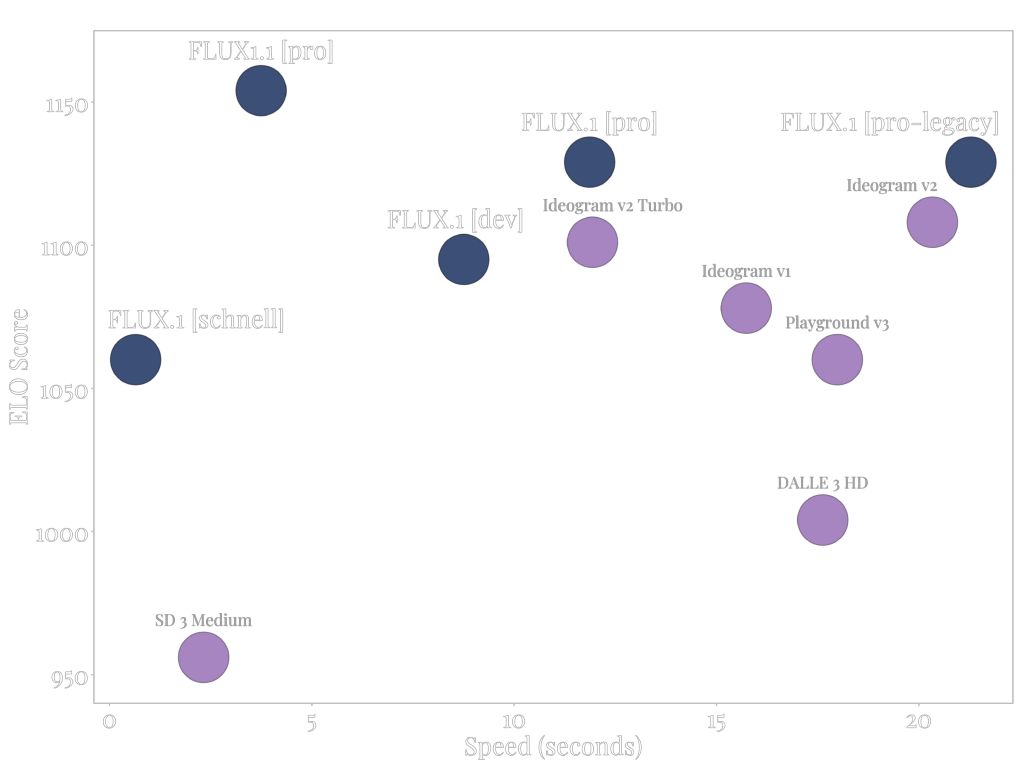 截至 2024 年 10 月 1 日,Flux 1.1 Pro 在视觉逼真度和提示准确性方面表现优异,Elo 分数达到了 1153,超过了 Midjourney 6.1 等其他竞争模型。