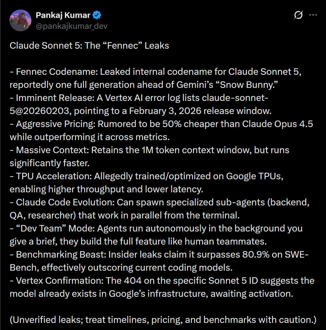 随后,知名AI博主Pankaj Kumar直接下场确认—— Claude Sonnet 5的代号是Fennec,已经在Google基础设施中了。