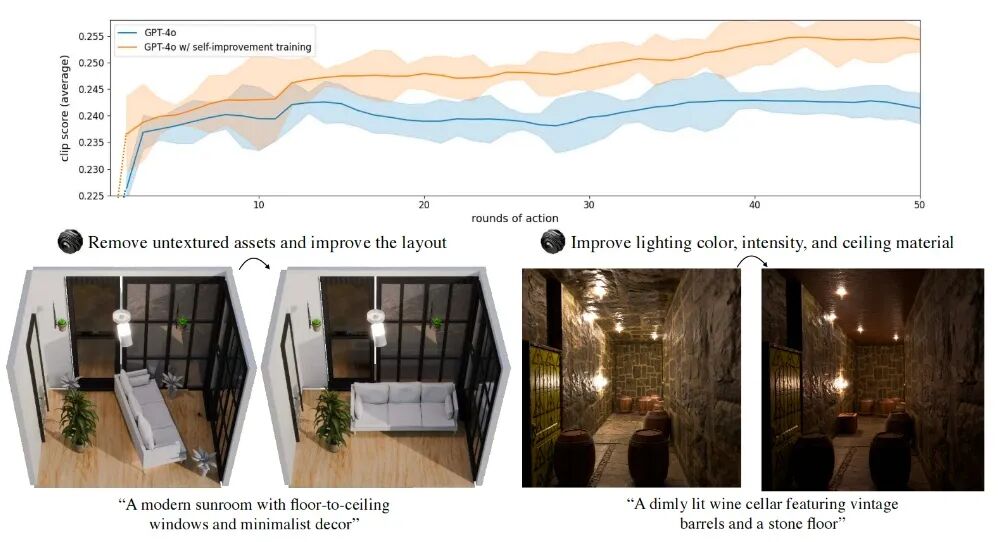 经3轮自改进微调后,3D-GENERALIST的CLIP分数达0.275,显著高于无微调版本和无上下文库版本,且能迭代修正场景缺陷。