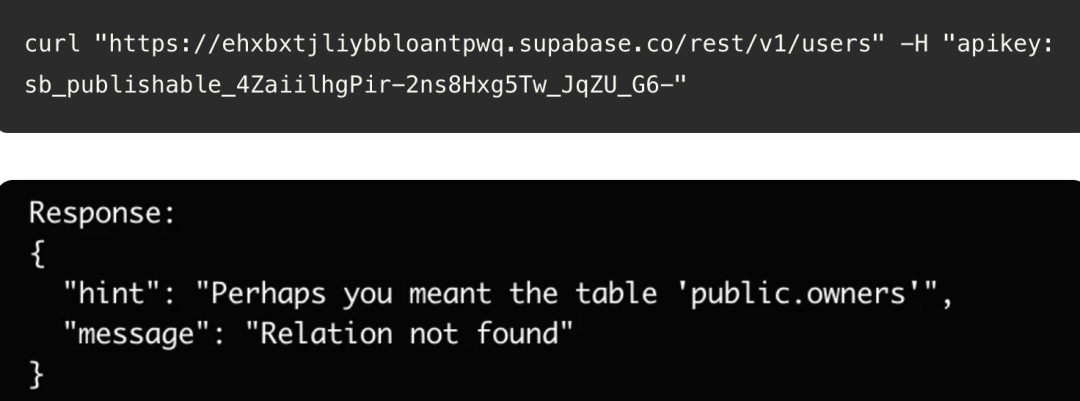 他们利用Supabase的PostgREST错误提示,枚举出了不少数据表。通过查询不存在的表名,系统返回的报错信息会泄露线索,从而暴露出真实的数据库结构。
