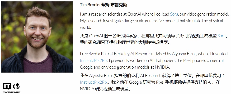 IT之家注意到,Tim Brooks 在加州大学伯克利分校人工智能研究所获得博士学位,并发明了 InstructPix2Pix。他曾在谷歌为 Pixel 手机摄像头提供 AI 支持,在英伟达研究视频生成模型,他还是 OpenAI 文生图模型 DALL・E 的主要研究员。