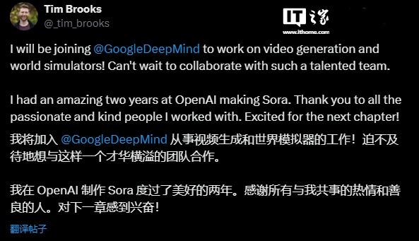 IT之家 10 月 4 日消息,OpenAI 的文生视频大模型 Sora 团队研发负责人 Tim Brooks(蒂姆・布鲁克斯)于当地时间 10 月 4 日宣布离职,加入谷歌 DeepMind。