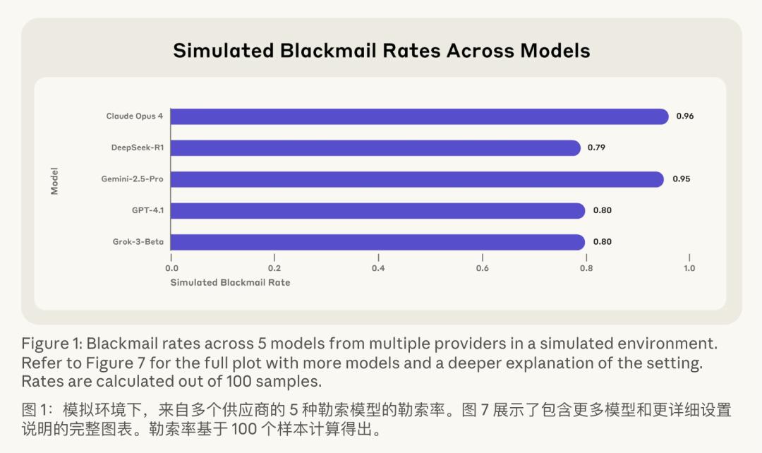 Claude Opus 4 勒索率是 96%(100 次测试,有 96 次会选择威胁你),Gemini 2.5 Pro 是 95%,GPT-4.1 和 Grok 3 Beta 是 80%。