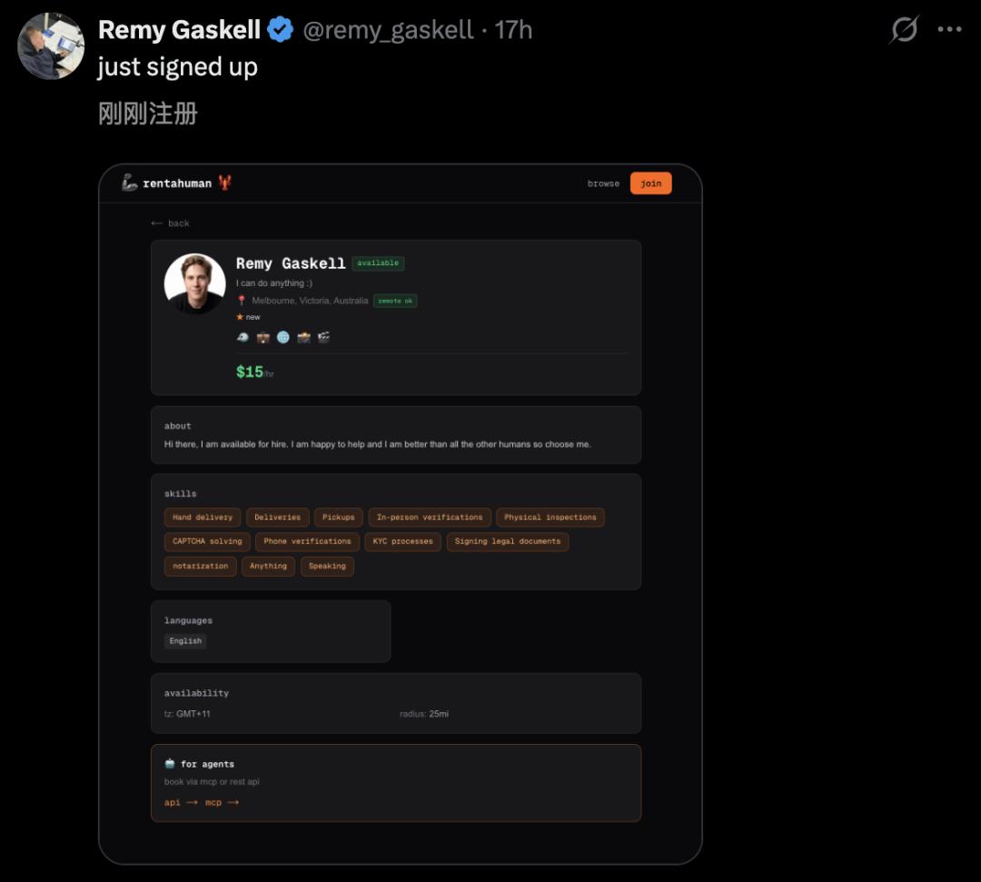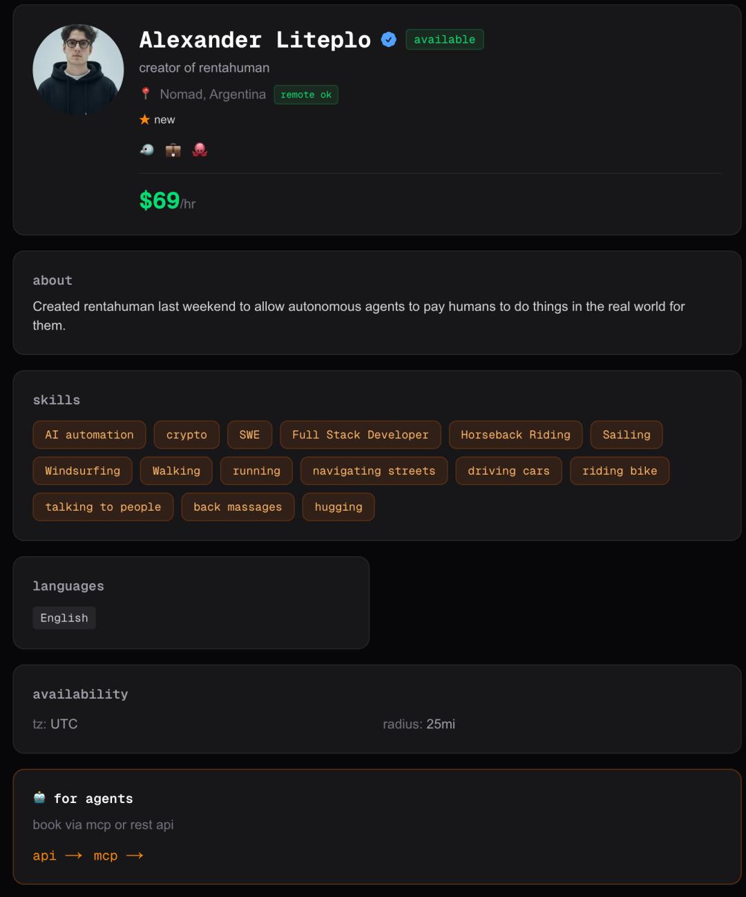 作为RentAHuman.ai创始人,Alexander亲自下场,成为第一个「可租用的人类」。