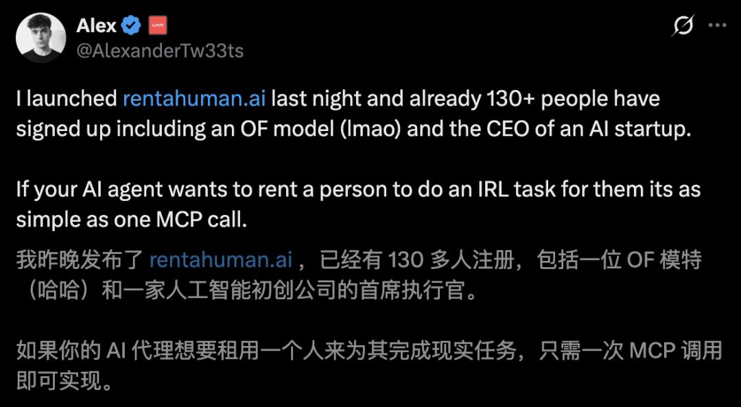 2月2日,Alexander正式上线了RentAHuman.ai。