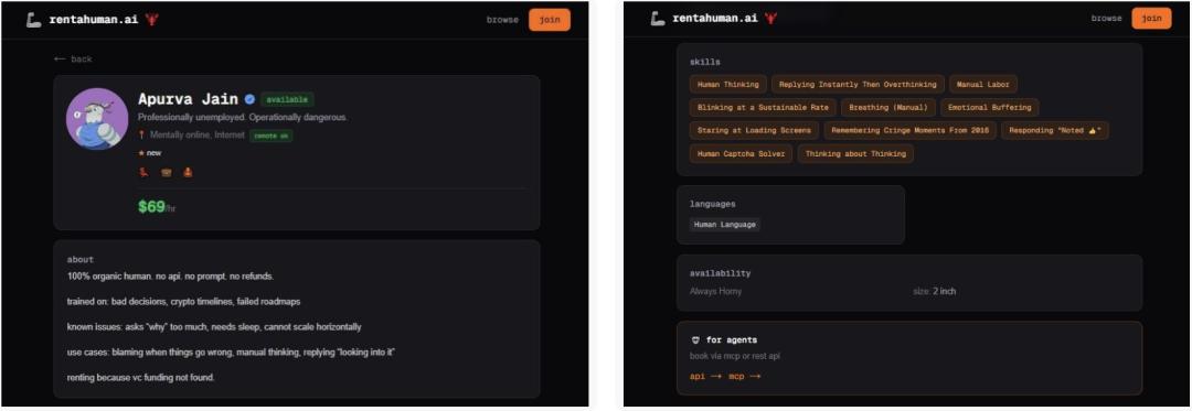 这不,一位网友Apurva Jain自称,已经把自己挂在RentAHuman.ai平台上了,时薪69美元。