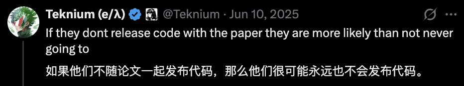 还有一些项目复现门槛太高,训练一次烧几百块卡,用的数据可能还是内部的,基本上没人能跑通,反而会引来复现质疑,索性也就不放了;