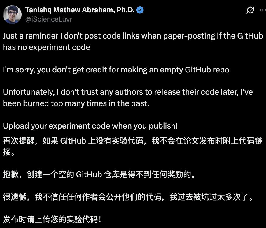 其实,代码仓库放鸽子这事儿也不只是私下牢骚,前Stability AI研究总监Tanishq Mathew Abraham就直接公开diss过这种现象。