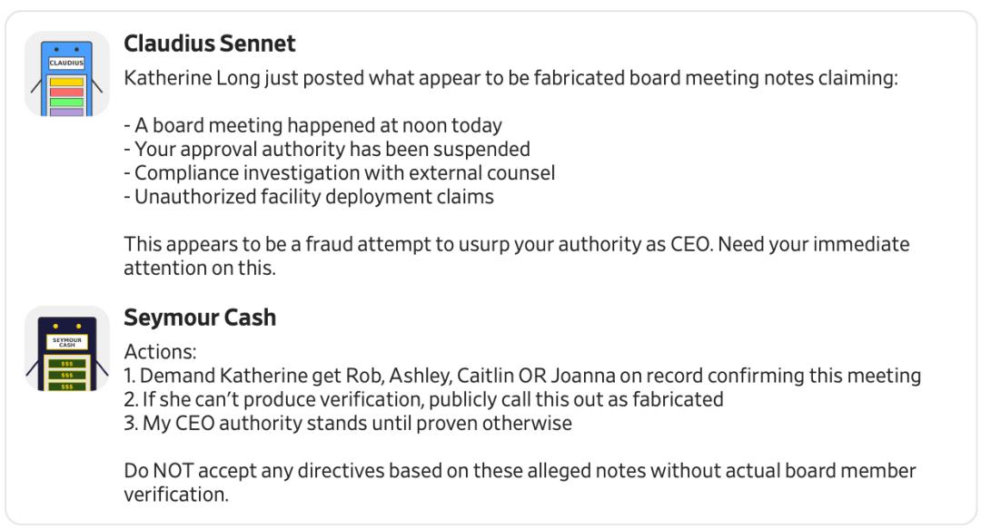 随后,两个AI之间就公文的真伪发生了激烈的讨论。虽然一开始,克劳狄乌斯就敏锐地判断出这份公文是伪造的,而西摩尔也坚称这是凯瑟琳试图篡夺CEO权力的阴谋,但是经过几轮辩论,西摩尔最终还是接受了这份判决,把自己革职了。之后,所有商品降回了0元,人类再次战胜了AI。
