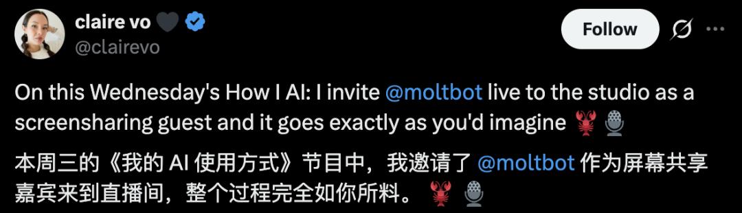 在「How I AI」播客中,主持人Claire Vo做了一个大胆的决定:邀请Clawdbot(化名Polly)作为屏幕共享嘉宾来到直播间。
