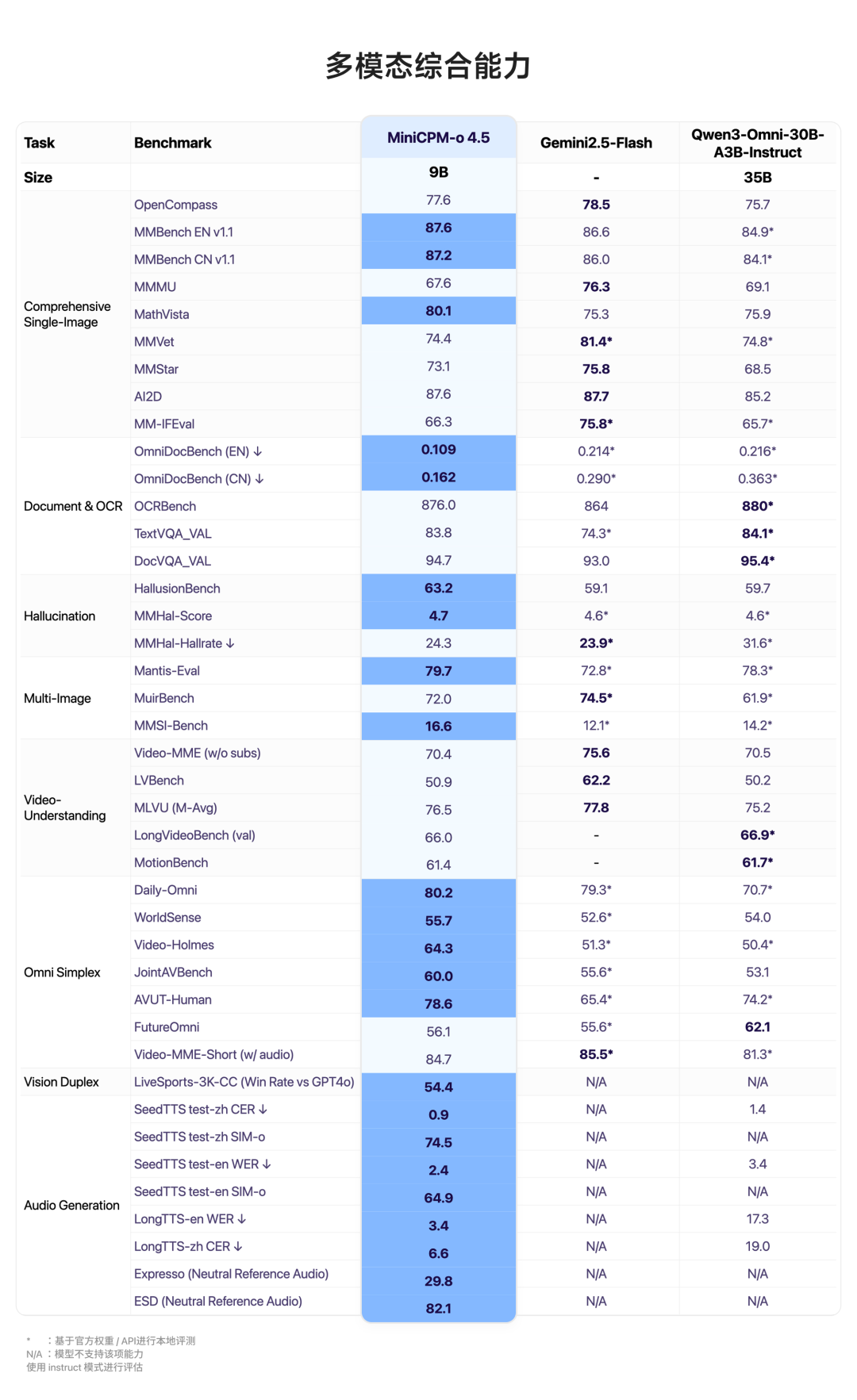 沿袭面壁小钢炮一贯的“高密度”特点,MiniCPM-o 4.5 仅靠 9B 参数,在全模态、视觉理解、文档解析、语音理解和生成、声音克隆等方面,均做到了全模态模型 SOTA 水准。