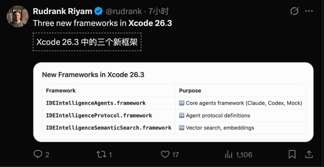 Xcode 26.3引入了三个新的框架,全是和IDEIntelligence相关,第一个就是Agent。