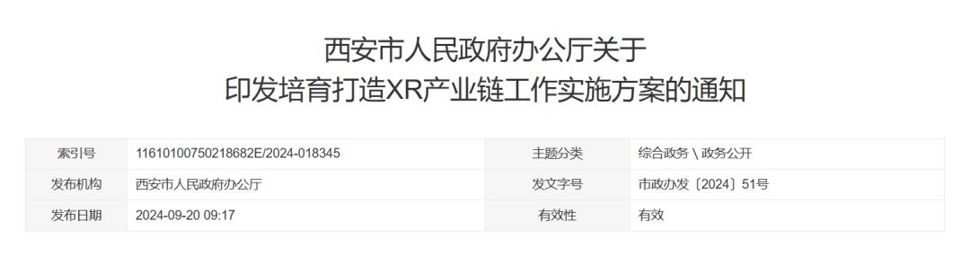 西安市政府官网发布了《西安市人民政府办公厅关于印发培育打造XR产业链工作实施方案的通知》,对于未来XR产业发展作出详细部署。