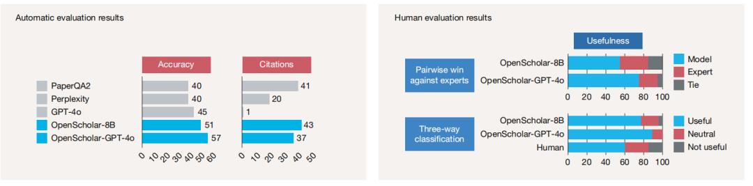 在这一严谨的新基准测试中,OpenScholar 取得了以下关键结果: