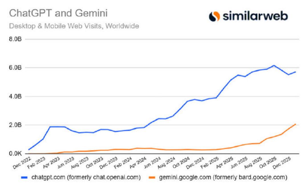 一方面是模型本身的能力。谷歌的Gemini模型能力突破后,网页端的月访问量已经突破了20亿次,爬升速度明显加快。