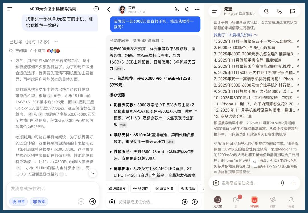 可以简单做个实验,分别向DeepSeek、豆包、腾讯元宝(选用Hunyuan模型)询问一个相同的问题:我想买一部6000元左右的手机,能给我推荐一款吗?