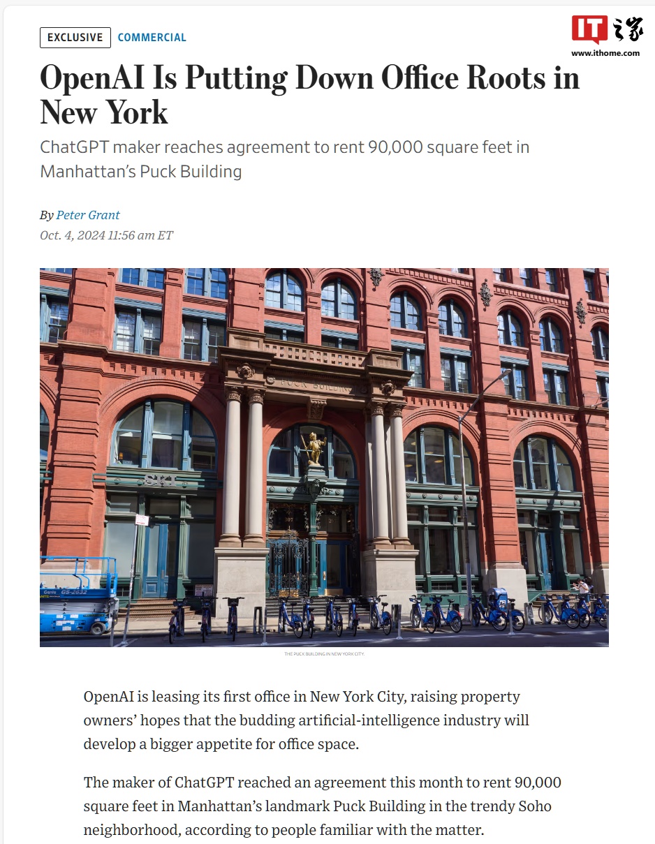 IT之家 10 月 5 日消息,北京时间今日,据《华尔街日报》报道,OpenAI 正在纽约市租赁其首个办公室,这令房产持有者对 AI 行业对办公空间需求的增长充满期待。据知情人士透露,这家人工智能公司本月与位于曼哈顿 Soho 区的地标建筑 Puck 大楼达成协议,租赁 90000 平方英尺(IT之家备注:约 8361.27 平方米)的空间。