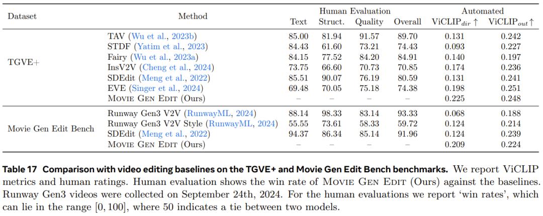 该方法的效果非常显著,在两个数据集上的人类和自动评估结果基本都优于其它对比方法。顺带一提,Movie Gen Edit Bench 是 Meta 提出的一个新基准,用于评估「下一代视频编辑模型的视频编辑能力」。