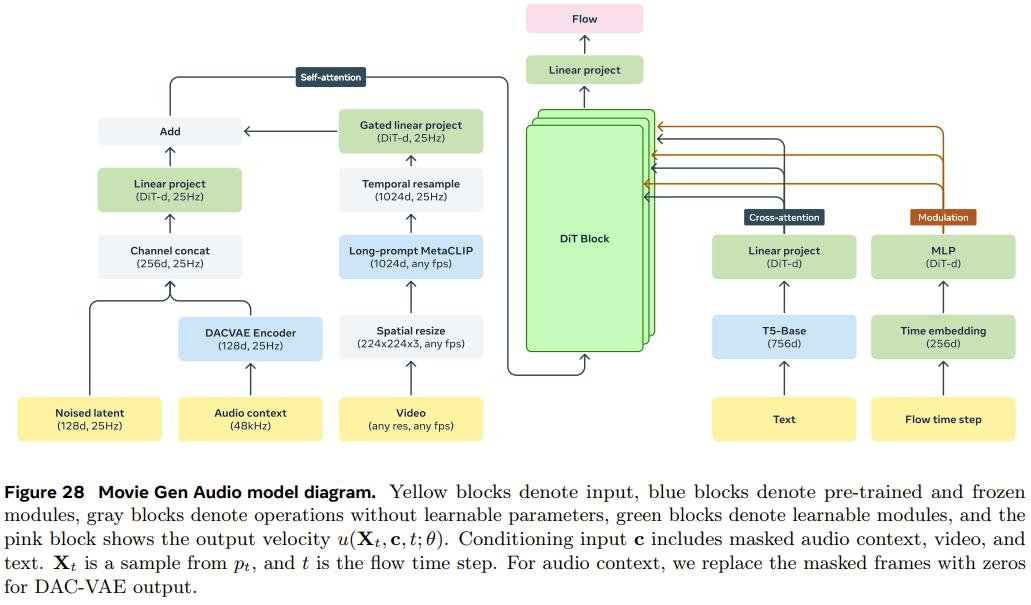 下面是 Movie Gen Audio 的模型示意图,可以看到其采用了基于流匹配(flow-matching 生成模型和扩散 Transformer(DiT)的模型架构。此外,还添加了一些条件化模块来实现对模型的控制。