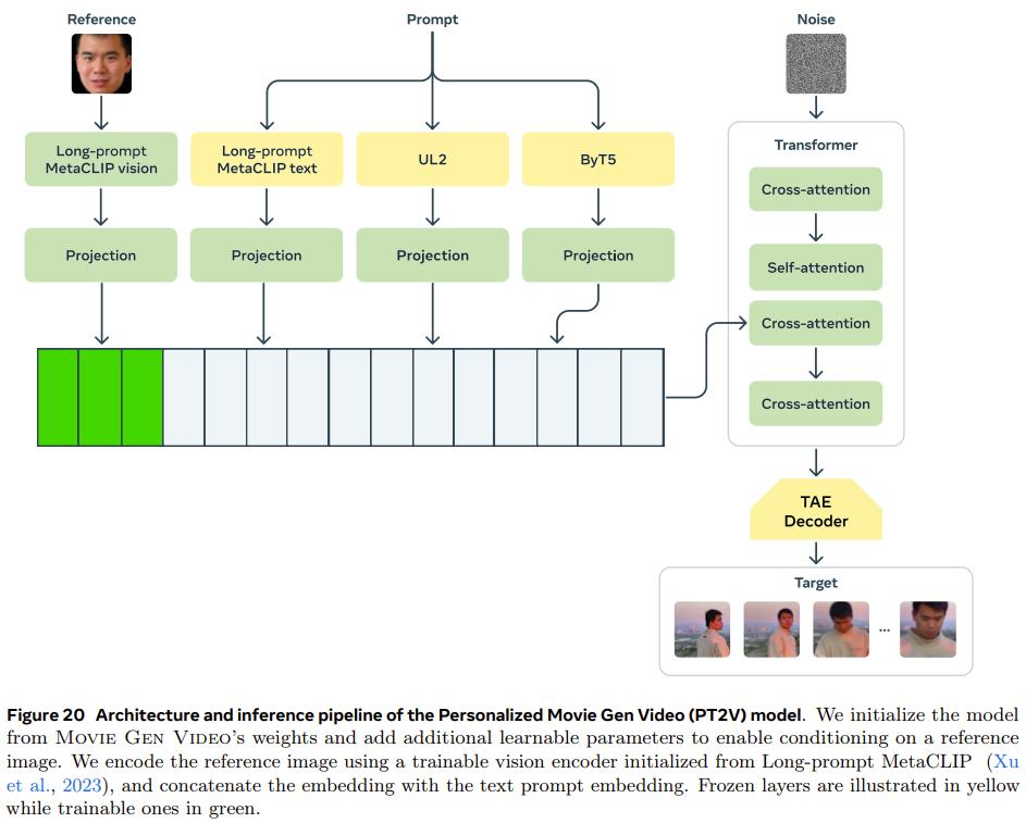 下图展示了个性化 Movie Gen Video 模型(PT2V)的架构和推理流程。