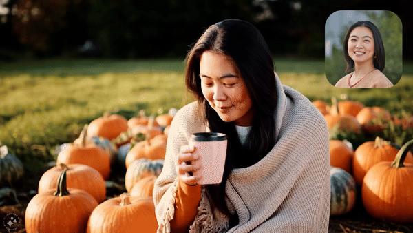 prompt:一名女子正坐在南瓜田的草地上。她围着围巾,手里拿着一个杯子。背景中是一排排南瓜。