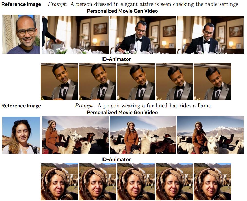 基于上述基础模型,Meta 还开发出了个性化视频功能。用户只需提供人物图像输入和对应的文本提示词,就能生成包含该人物以及文本描述的细节的视频。Meta 表示 Movie Gen 生成的个性化视频在保留人类身份和运动方面做到了 SOTA。