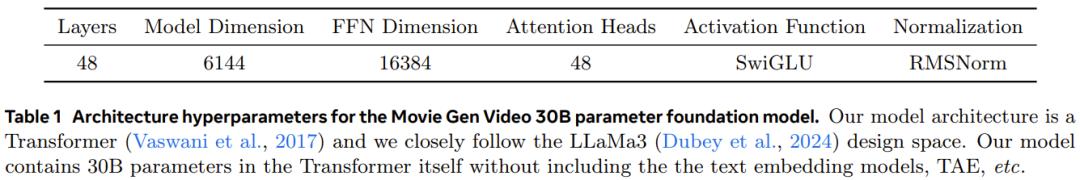 模型架构上,他们采用了 Transformer,整体位于 Llama 3 的设计空间中。下表展示了其 30B 参数基础模型的各个超参数。值得注意的是,这里的 30B 参数指的是 Transformer 本身的参数量,并不包含文本嵌入模型、TAE 等。