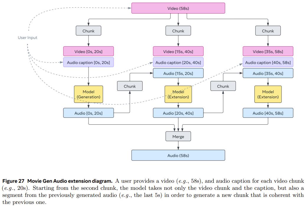 此外,他们还提出了一种音频扩展技术,可以为任意长度的视频生成连贯的音频。下面是该技术的示意图。其目标是一次生成 30 秒长度的音频,然后利用该扩展延展至任意长度。