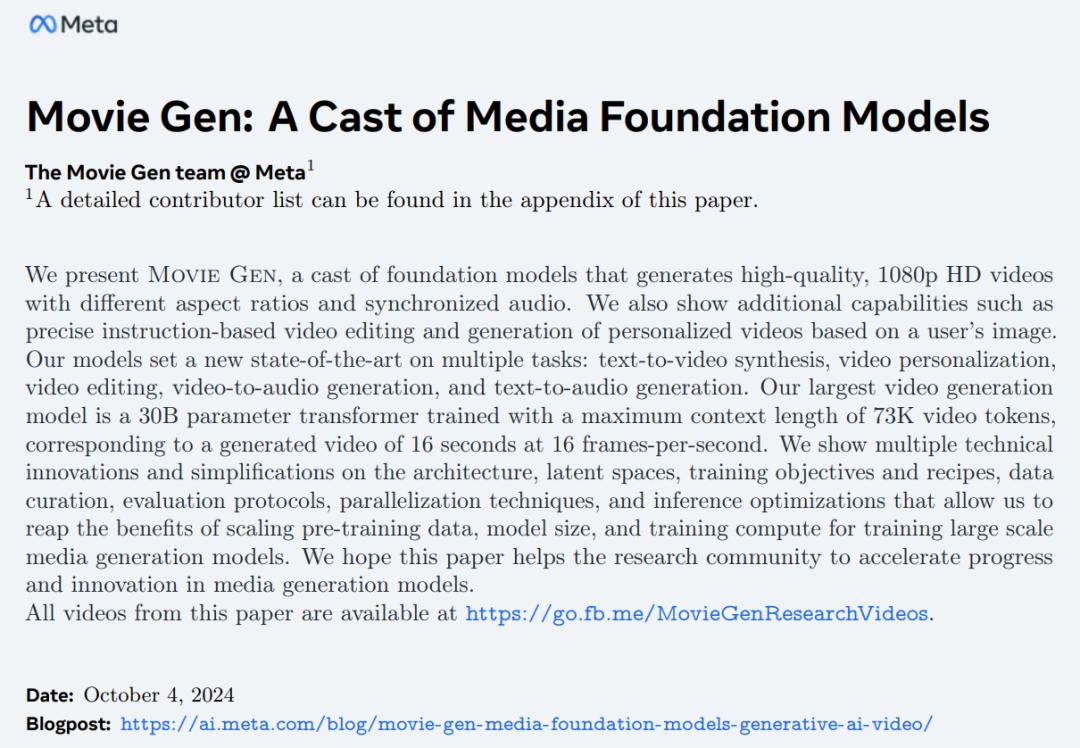 在 OpenAI Sora 难产的时候,Meta 首次公开展示了自家的「用于媒体的突破性生成式 AI 研究」:Meta Movie Gen。