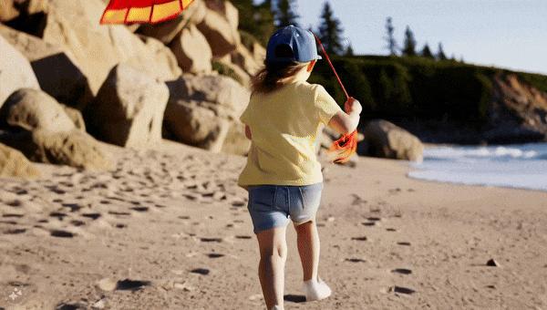 prompt:一个女孩正在海滩上奔跑,手里拿着一只风筝。她穿着牛仔短裤和黄色 T 恤,阳光洒在她身上。