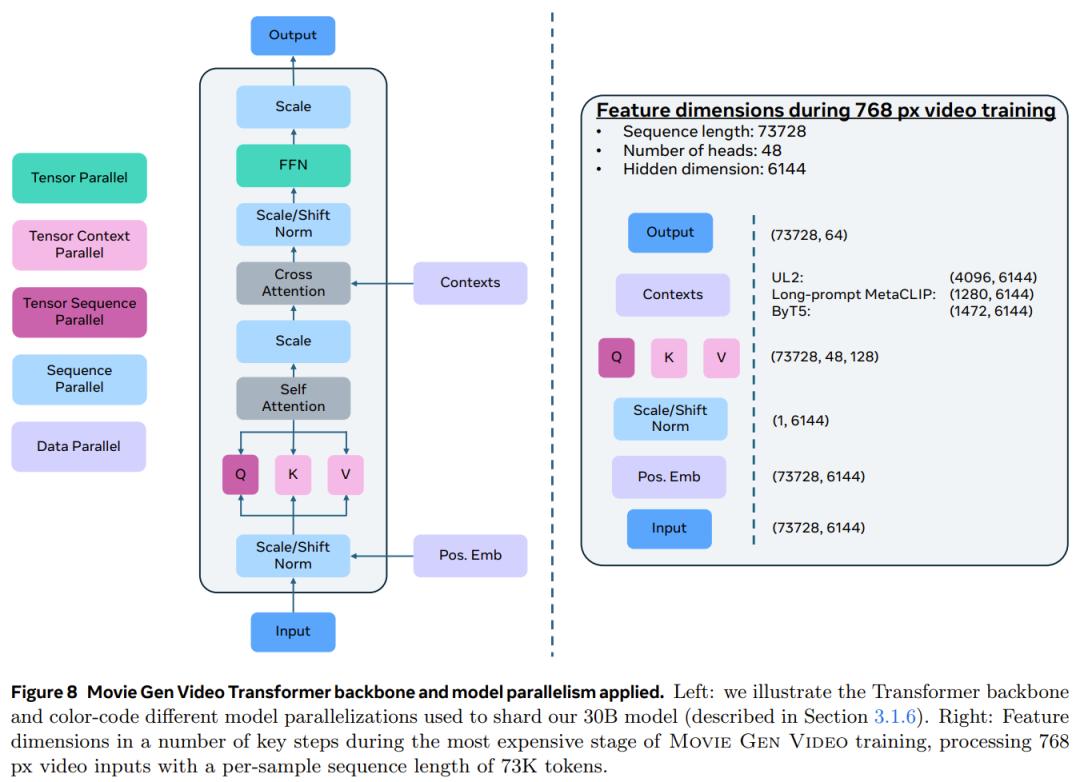 下图展示了 Movie Gen Transformer 骨干网络的整体结构以及所使用的模型并行化机制。具体来说包括张量并行化(TP))、序列并行化(SP)、上下文并行化(CP)和全共享式数据并行(FSDP)。
