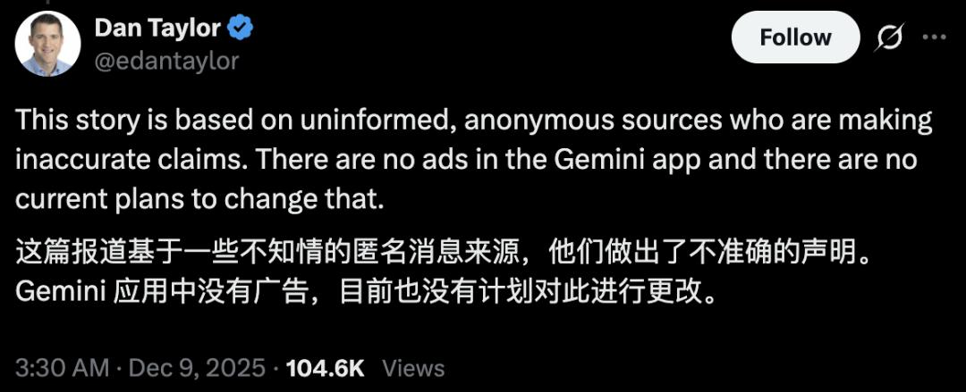 他表示Gemini应用中目前没有广告,也暂无添加广告的计划,并指出广告目前仅在美国的英文版AI概览(AI Overviews)中展示。