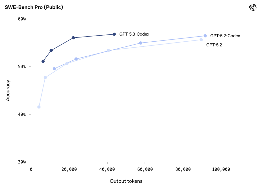 在覆盖四种编程语言,不仅抗污染,还全是真实世界的硬核工程难题的 SWE-Bench Pro 基准测试中,GPT-5.3-Codex 也表现出了 SOTA 水准,而且用的 Token 比以往任何模型都少。