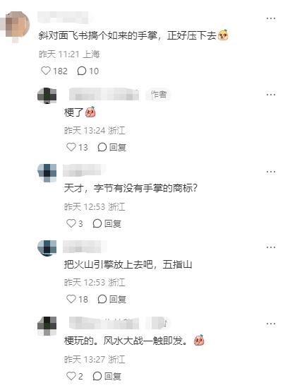 更有网友表示这可能和风水有关,其觉得或许钉钉开始相信风水了,而也有“天才”网友脑洞大开,开始给飞书那边“支招”,表示“飞书搞个如来的手掌,可以压下去”,最后搭配上火山引擎就筹齐了直接变成“五指山”。