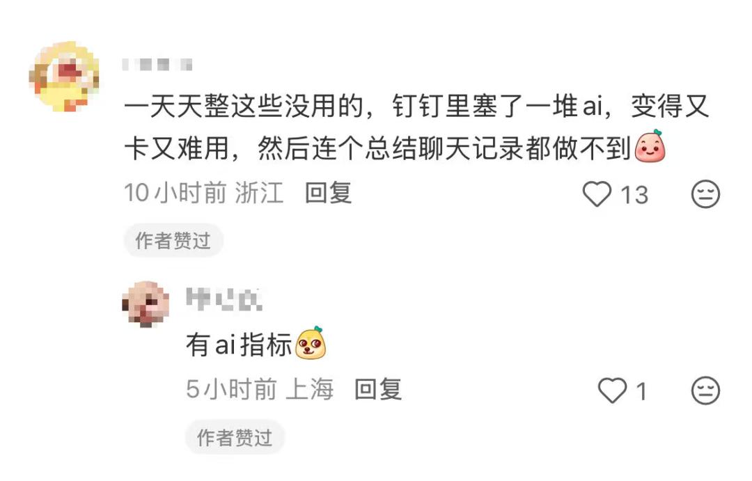 一位来自浙江的网友评论到:“钉钉里塞了一堆ai,变得又卡又难用,然后连个总结聊天记录都做不到。”